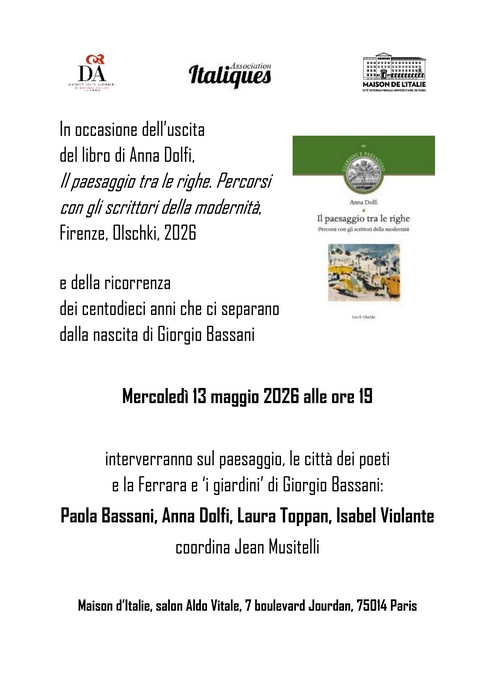 Mercredi 13 mai à 19h, à l’occasion de la parution du nouveau livre d’Anna Dolfi, une des critiques les plus pertinentes et compétentes qui soit sur Giorgio Bassani, Il paesaggio tra le righe. Percorsi con gli scrittori della modernità (Le paysage entre les lignes. Parcours avec les écrivains de la modernité), Florence, Olschki, 2026, et à l’occasion de l’année du 110e anniversaire de la naissance de Giorgio Bassani, vous êtes invités à une rencontre qui se déroulera à la Maison de l’Italie – Cité internationale universitaire, Paris 14e. Cette soirée est organiséeen collaboration avec La Dante – comité de Paris et l’association Italiques.