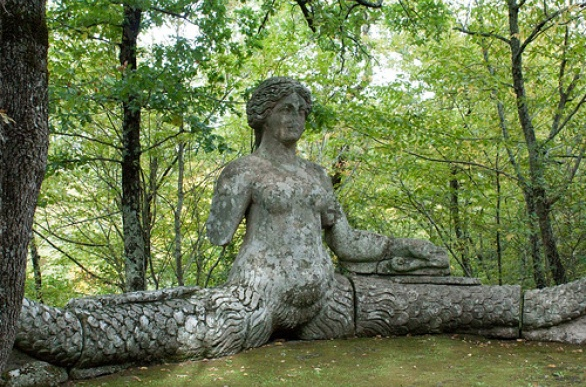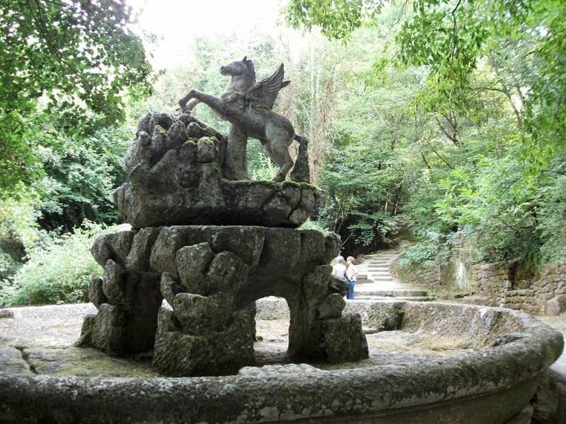 Strano personaggio il condottiere Orsini: esiliato da Roma verso la metà del ‘500, si fece costruire un palazzo sulle fondamenta del vecchio castello e il giardino sacro ispirato, sembra, al fantastico bestiario dell’Orlando Furioso. Manca però nel Parco la levità e la gioia del modello letterario: mal si accordava infatti uno spirito malinconico come l’Orsini con le olimpiche, siderali invenzioni ariostesche. Parla il misterioso Bosco il linguaggio di archetipi che suscitano sentimenti di sgomento, paura, meraviglia, di dei, demoni, eroi e semi-dei, ma anche di miti divenuti nel tempo impenetrabili, legati ai primordi della cultura occidentale come il culto del sole e dei morti.