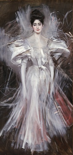 Rittratista di fama internazionale di una generazione precedente a quella di Mucha, Boldini, ferrarese d’origine, si afferma nella Parigi della Belle-epoque grazie al suo talento straordinario nel restituire il carattere intimo, spregiudicato e disinvolto di una nuova femminilità agli albori del XX secolo mentre le sue figure femminili divengono presto il simbolo di una nuova epoca. Si scorge lì, nella modernità dei suoi ritratti, la percezione di una donna nuova, solitamente sottile o lungi forme vista come attraverso uno specchio rilucente in pochi tratti fluidi ed essenziali che riflettono perfettamente lo spirito vitale e mutato della modernità. Ora avvolta da un fascino misterioso simile a una borghese distante e altolocata, ora in una visione più gioiosa, di vivida giovinezza come in “Fuoco d’artificio” (1985). Qui un abito leggero fatto di drappi bianchi restituisce agli spettatori una ventata di leggerezza.