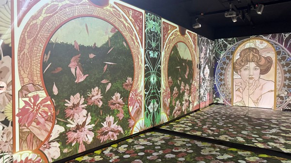 I fiori sbocciano, emergono in superficie e si aprono dagli sfondi dei quadri o dei manifesti magnificati dall’immagine digitale animata, tridimensionale quasi, espandendo verso di noi dalle pareti della saletta. Irradiano insieme ai colori pastello i volti animati dei ritratti. Essi prendono vita di fronte ai nostri occhi immergendoci letteralmente nella particolare atmosfera dei quadri, quella visione spirituale con la quale Mucha intendeva esaltare il potere del femminile attraverso l’aurea di un volto, una figura immersa in una dimensione unica che la rende icona moderna. Idealizzata ed espansa attraverso l’installazione sulle quattro pareti della stanza come in un mondo di sogno ad occhi aperti nel quale noi visitatori siamo chiamati a entrare fisicamente, lasciarci trasportare con il corpo e i sensi tutti in una vera e propria esperienza immersiva.