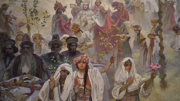 Nel 1910 Mucha decide di rientrare definitivamente in Boemia dopo anni di assenza per realizzare forse il sogno di una vita: rendere la propria arte strumento di espressione e lotta per il proprio popolo affermando valori libertari e nazionalisti in primo luogo l’indipendenza dall’impero austro-ungarico. Tale tema è perfettamente rappresentato dalla tela “ Canto boemo” (1918) dove tre giovani donne compaiono nella loro sensualità sullo sfondo bucolico di una collina in abiti tradizionali boemi incarnando i valori di libertà e patriottismo. “L’artista deve insegnare al popolo ad amare la bellezza”, scriveva Mucha a proposito della sua visione estetica, e tale appare il senso ultimo del monumentale ciclo pittorico, “Epopea Slava”: narrare i momenti fondanti della storia slava dal III al XX secolo in un grandioso racconto per immagini che esalta i valori di libertà e progresso per una nazione di lì a poco nascente.