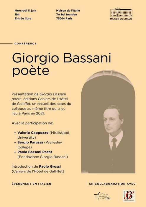 La soirée, organisée en collaboration avec l’Instituto italiano di Cultura de Paris, sera modérée par Paolo Grossi, directeur de la collection des Cahiers de l’Hôtel de Galliffet. Paola Bassani Pacht de la Fondation Giorgio Bassani de Ferrare et fille du grand écrivain sera elle aussi présente.