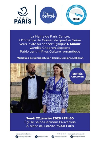Jeudi 22 janvier 2026 à 19h30, Camille Chapron, soprano, et Pablo Lentini Riva, guitare romantique, vous invitent à un concert  lyrique pour la nouvelle année dans l’une des plus belles églises parisiennes: Saint-Germain l’Auxerrois, 2 place du Louvre, 75001 Paris. ENTRÉE GRATUITE ! Venez nombreux.