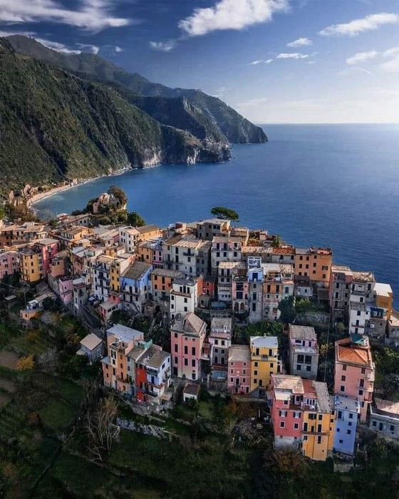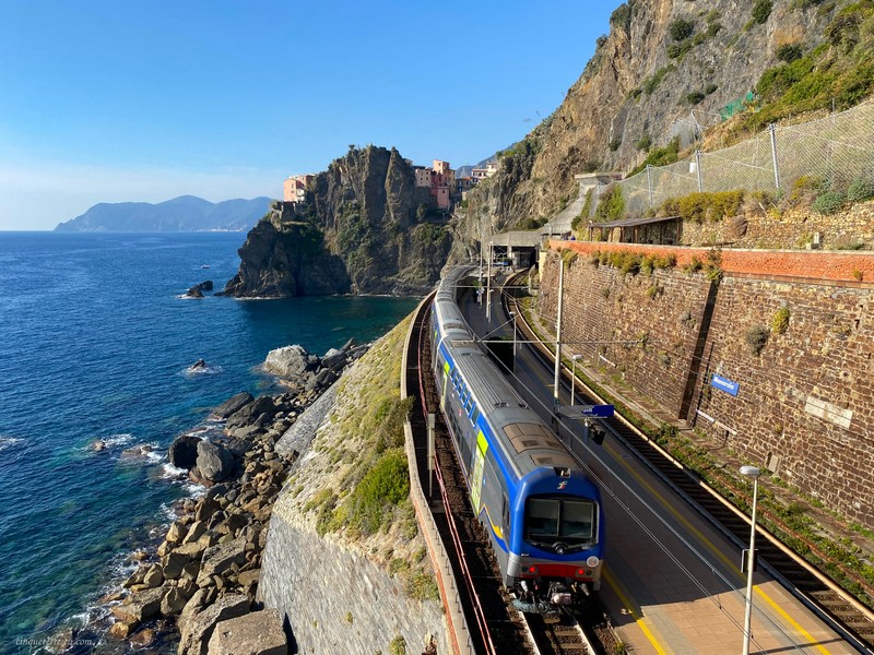 Al passeggero che giunge in macchina da Genova si apre davanti uno scenario incantato: rocce a strapiombo emergono da un mare verdissimo e ovunque sono agavi, mirti, corbezzoli, case in mezzo a minuscoli orti fra profumati alberi di limone e saporiti fichi d’India. In fondo si accovacciano i cinque Paesi che caratterizzano in modo unico il paesaggio e ne danno il nome, nelle strette valli formate dai torrenti che rotolano dalle montagne : Riomaggiore con il suo porticciolo, la ciazza aperta al mare dove si stendono le reti e il pesce viene messo a seccare mentre i gatti dormono sulle barche cullati dallo sciabordio delle onde che si infrangono sui muri delle case. Da qui i più romantici, ma dotati di buone gambe, possono raggiungere Manarola attraverso uno dei più celebri sentieri d’Italia, la Via dell’Amore. Manarola con il suo scenario di luci e ombre, sollecita da sempre la fantasia e la mano degli artisti.