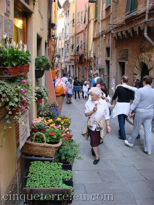 I terrazzi delle Cinque Terre sono fasce non più larghe di 5 o 6 metri, ma nelle zone più strette non arrivano a due, l’humus si è compattato con i detriti della roccia, sterpaglie e aghi di pino. La formazione di questo sottilissimo strato di terra ha permesso la coltivazione del vitigno roccese moltiplicatosi poi con il metodo della propaggine. Ogni volta che le acque portano giù i muretti e l’humus viene dilavato, c’è da recuperare la terra, ricostruire i muri franati, sempre col pericolo di mettere un piede in fallo e precipitare nel vuoto. In tempo di vendemmia l’uva viene portata nelle ceste inerpicandosi sugli erti, strettissimi sentieri costruiti per portare il prodotto fin nelle cantine dei paesi. Ma che vini poi da queste rocce! Erano già famosi e venivano commerciati fin dal 1200, quando navi genovesi li trasportavano in Inghilterra e in Olanda. Dei vini delle Cinque Terre ne parlarono Dante, Petrarca, Boccaccio, preziosi testimoni dei loro raffinati bouquets. Vino da amatori, non è mai divenuto prodotto di mercato, si differenzia di anno in anno e da produttore a produttore. Del resto chi dimentica, dopo averlo assaggiato, il delicato ed intenso profumo dello Sciacchetrà servito con la crostata di mele che ne esalta il sapore di viola, “quel fiero Sciacchetrà che si pigia nelle cinque pampinose terre” ? (G. D’annunzio – Le Faville del maglio).