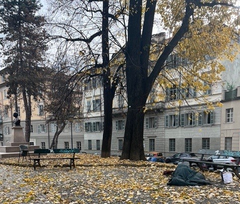 Sono le ore 13: l’auto è parcheggiata, lui invece è sdraiato lì vicino – parcheggiato anche lui – con le foglie come giaciglio, il busto di Gandhi che lo veglia, forse assonnato forse rassicurante.