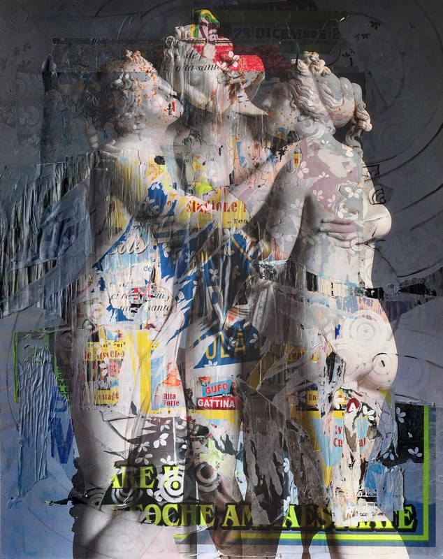Un’operazione narrativa, degna di un autorevole scrittore, dove l’impresentabile presente affonda le radici nell’antichità, una prospettiva che partendo dall’arte classica si collega al presente attraverso un ponte di due millenni, con una tecnica suggestiva che implica e connette stratificazioni di pittura, manifesti ed immagini. Una tecnica di cui Chisesi è padrone assoluto, la fusione, che consiste nell’imprimere uno scatto fotografico o immagini prese dal web, direttamente sulla tela, precedentemente dipinta e preparata con varie stratificazioni e sovrapposizioni di materiali quali gesso di bologna, acrilici, manifesti strappati dalla strada e foglia oro.